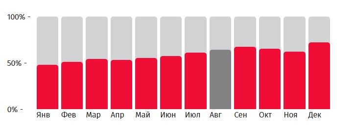 Ниже вы сможете увидеть диаграмму, которая демонстрирует уровень популярности маршрутов в каждый месяц года. Узнавайте уровень популярности, чтобы экономить на билетах.