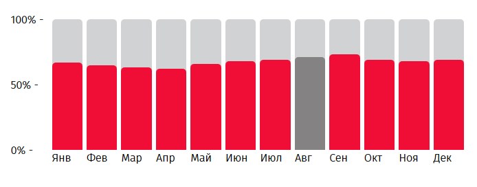Здесь находится диаграмма, отражающая степень востребованности маршрута в отдельные месяцы. Используйте данную статистику, определяя наиболее выгодные условия покупки билетов.